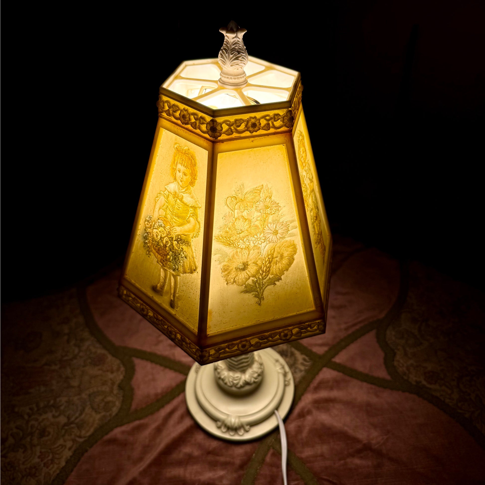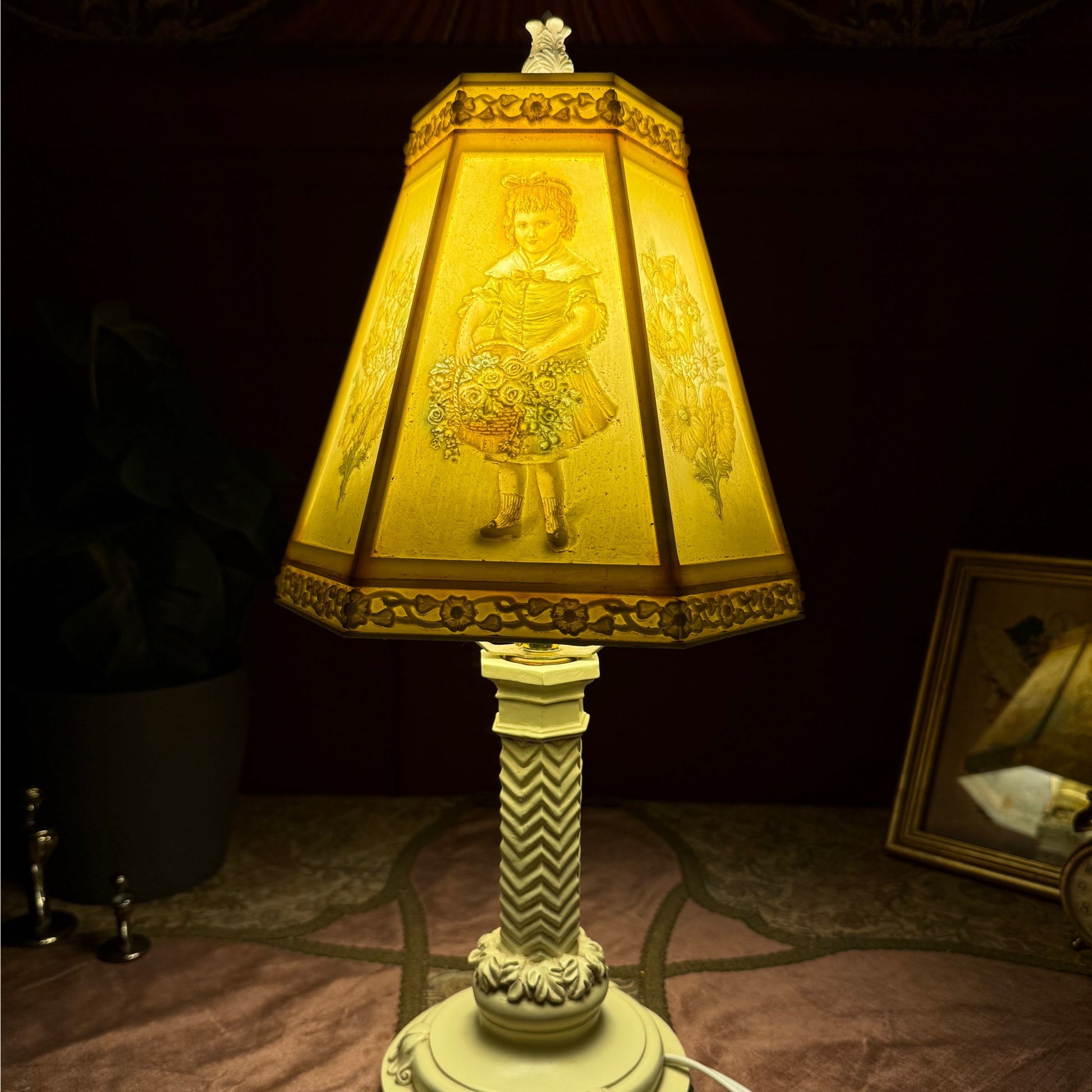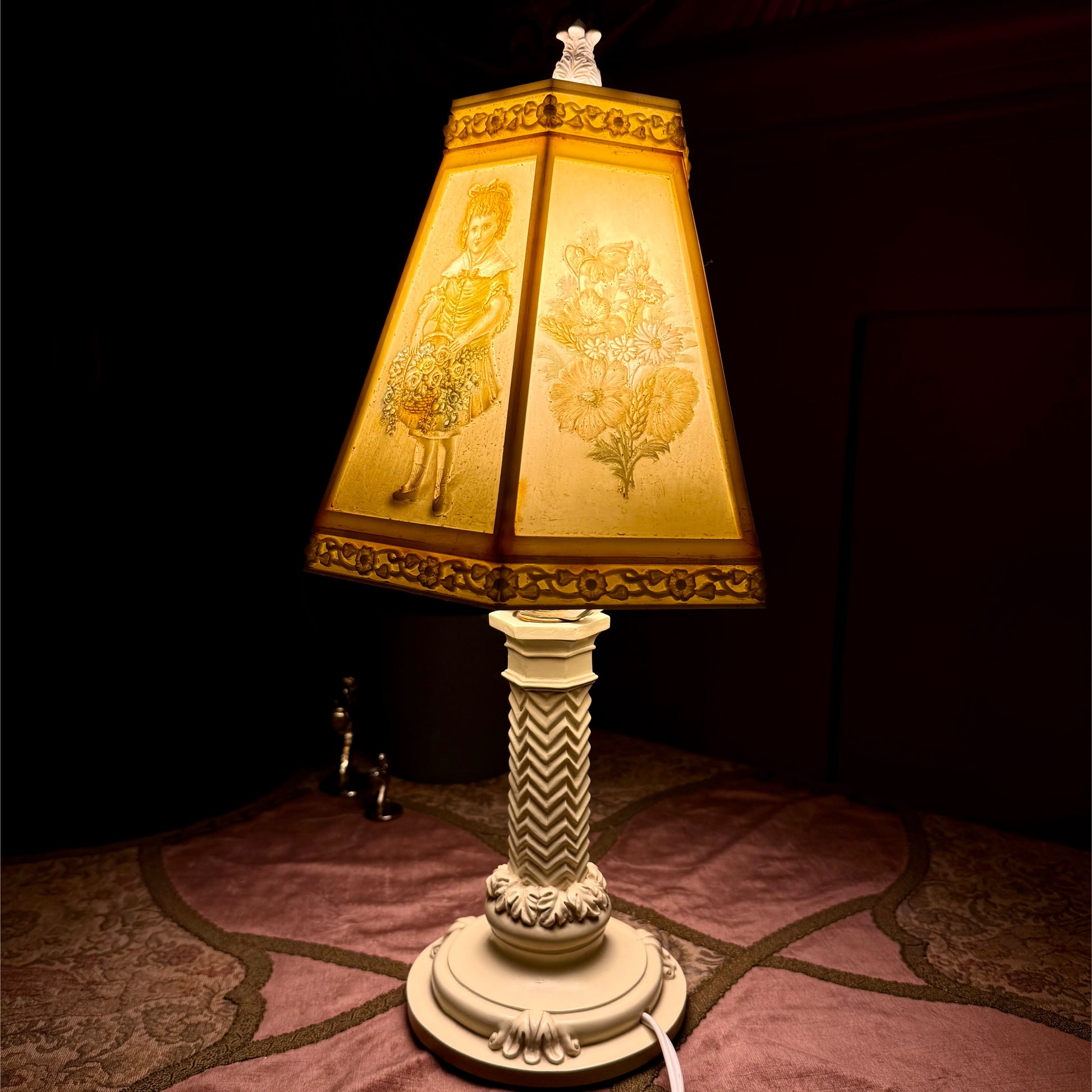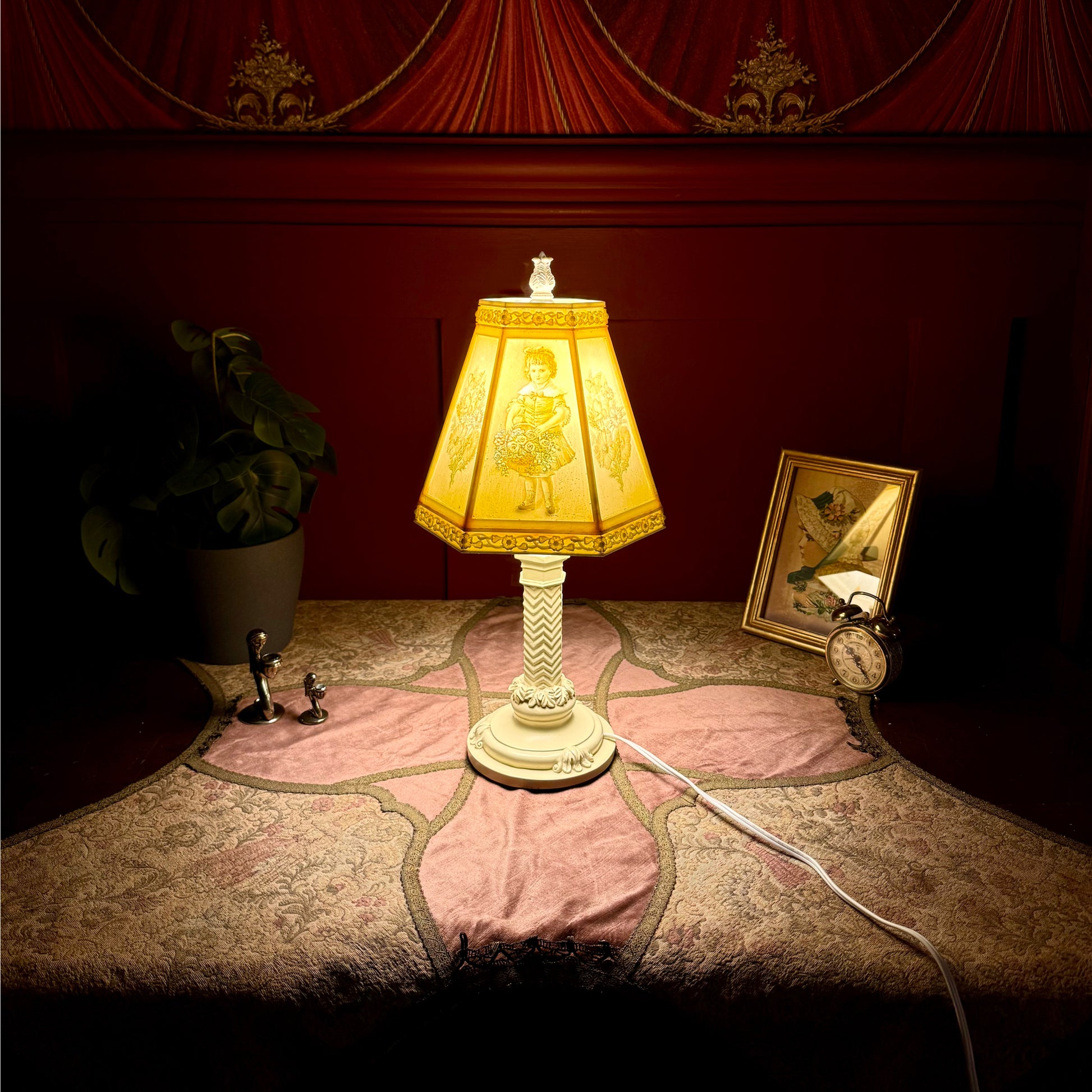 أبجورة فنتج بطراز فيكتوري مميزة بتصميم كلاسيكي فاخر، مزودة بظل Lithophane مكوّن من 6 ألواح مزخرفة بمشاهد رومانسية مستوحاة من العصر الفيكتوري. مصنوعة من مادة تحاكي الخزف العاجي المنحوت بدقة.