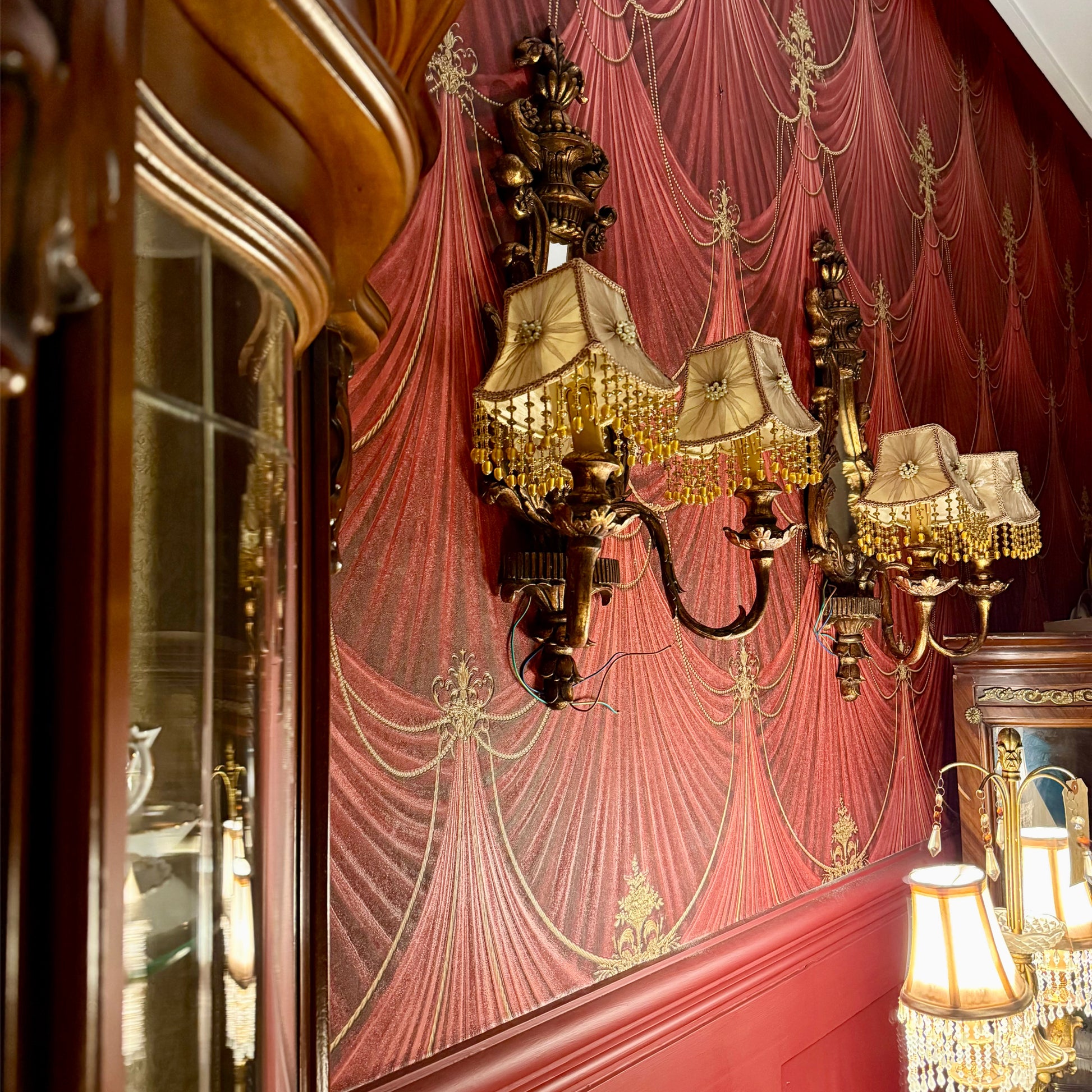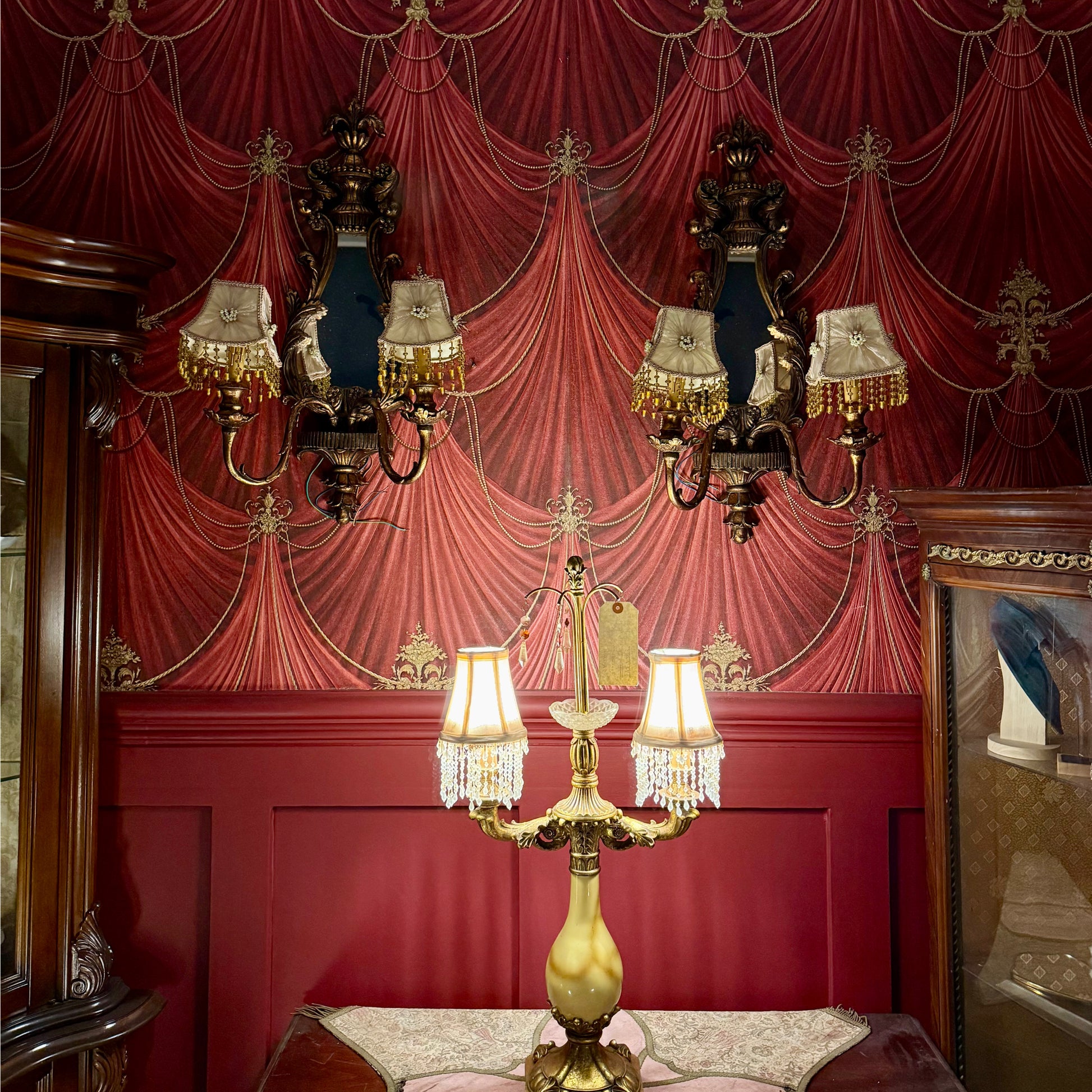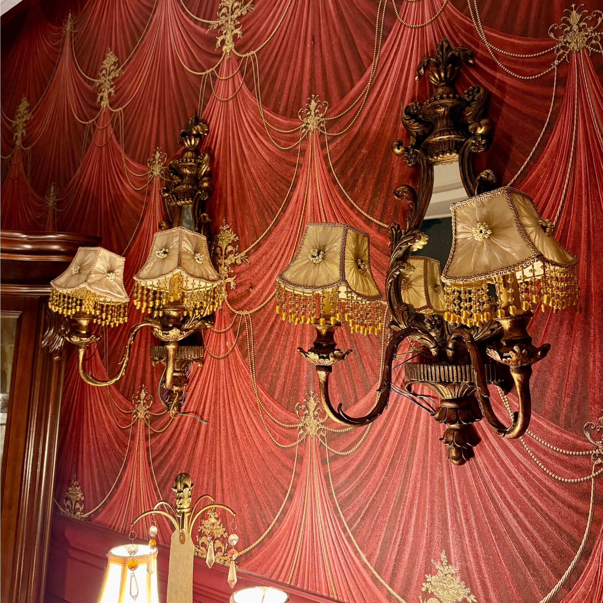 أبجورتين تعليق فنتج بتفاصيل محفورة أنيقة، ومظلّات قماشية بيج مزينة بحبات كريستال وتتميز بوجود (مرآة) في المنتصف