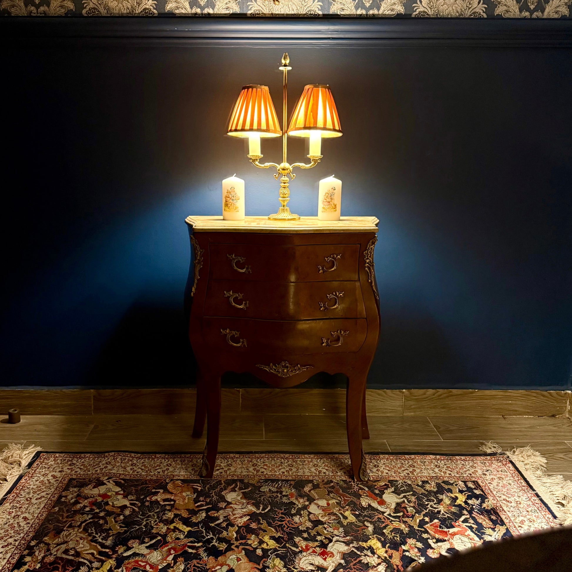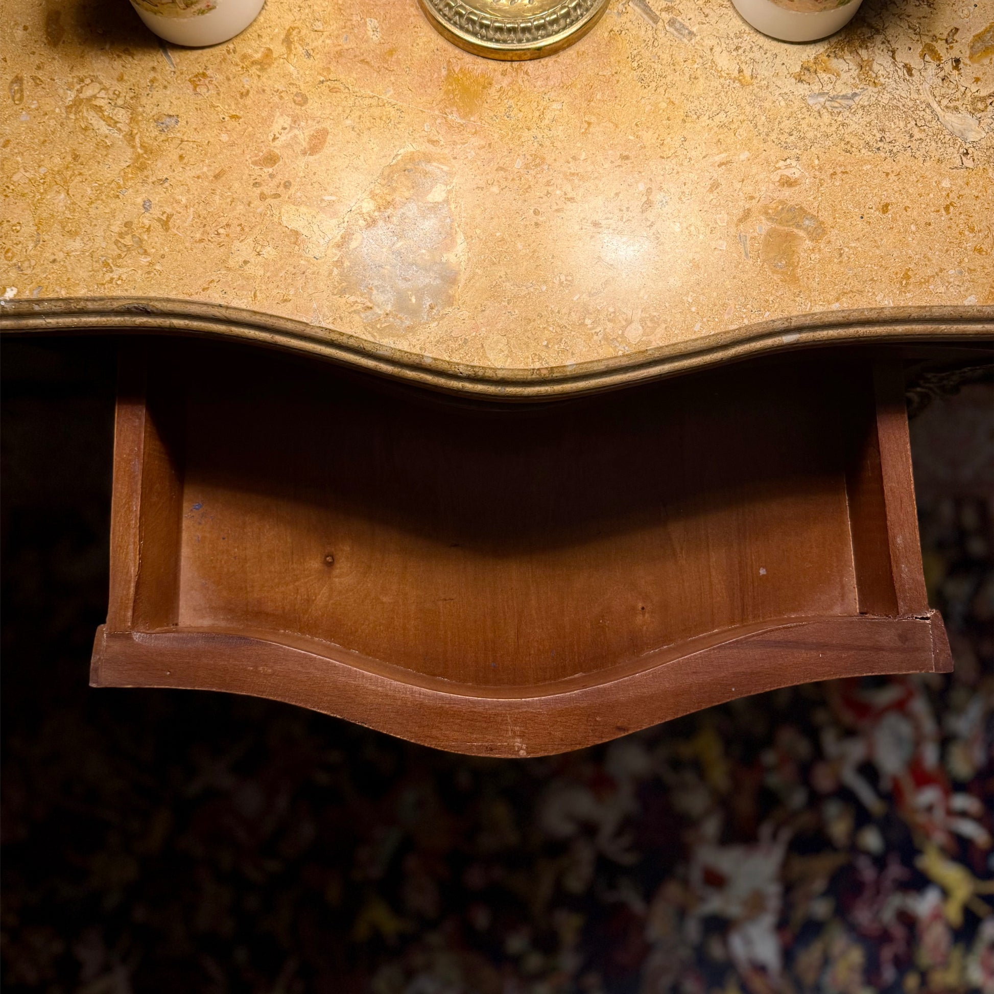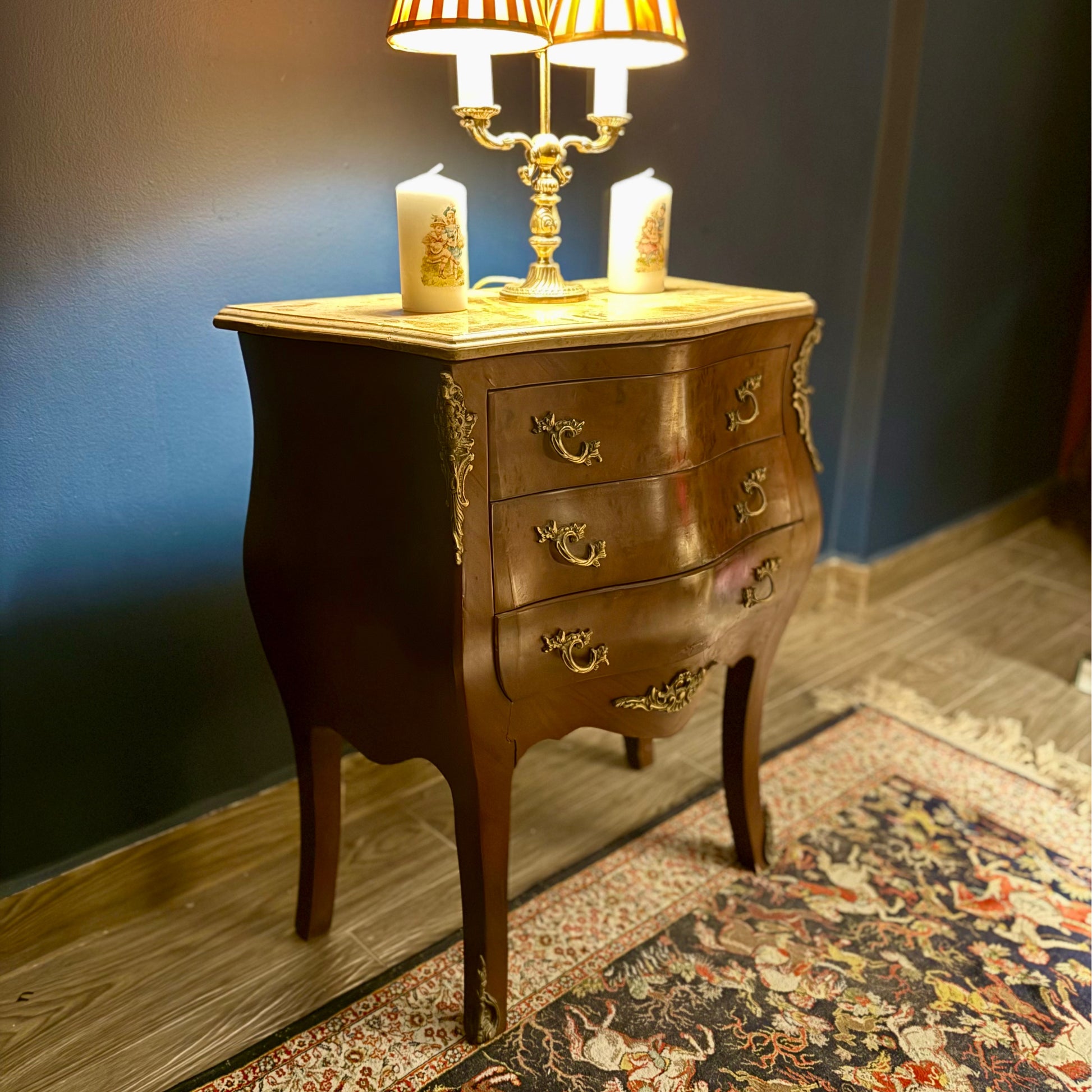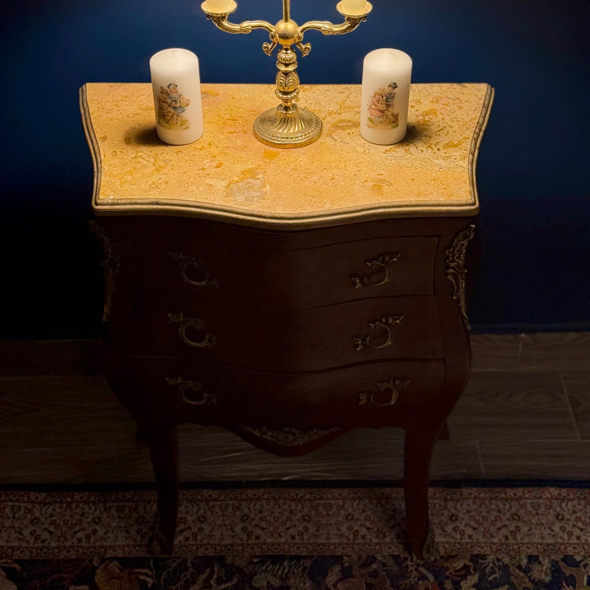 طاولة جانبية فنتج من الخشب البني بتصميم فرنسي، ثلاث أدراج مع مقابض وزخارف ذهبية عتيقة، بسطح من الرخام