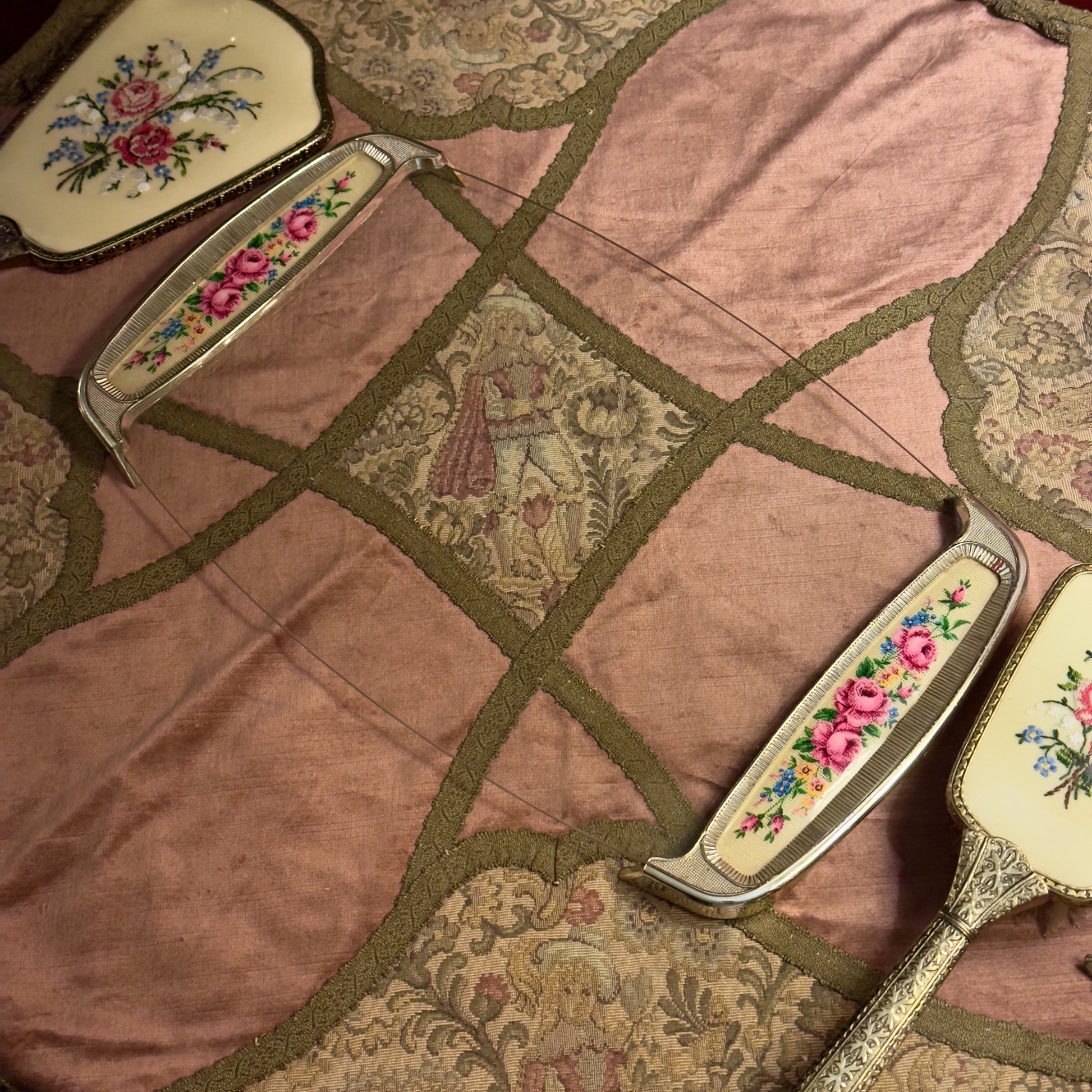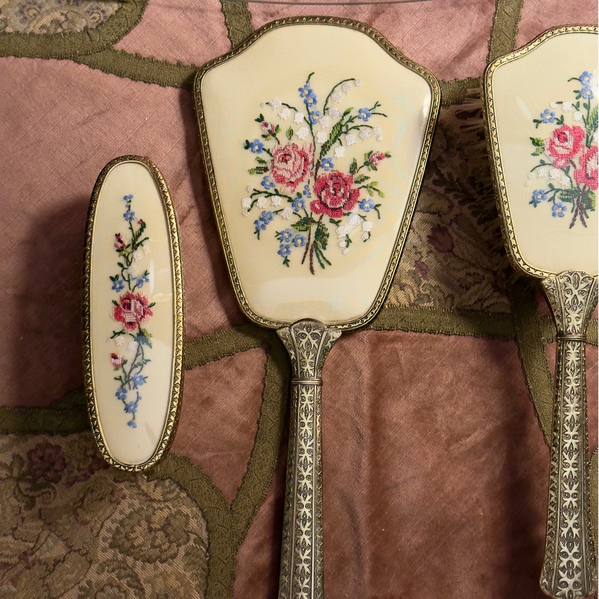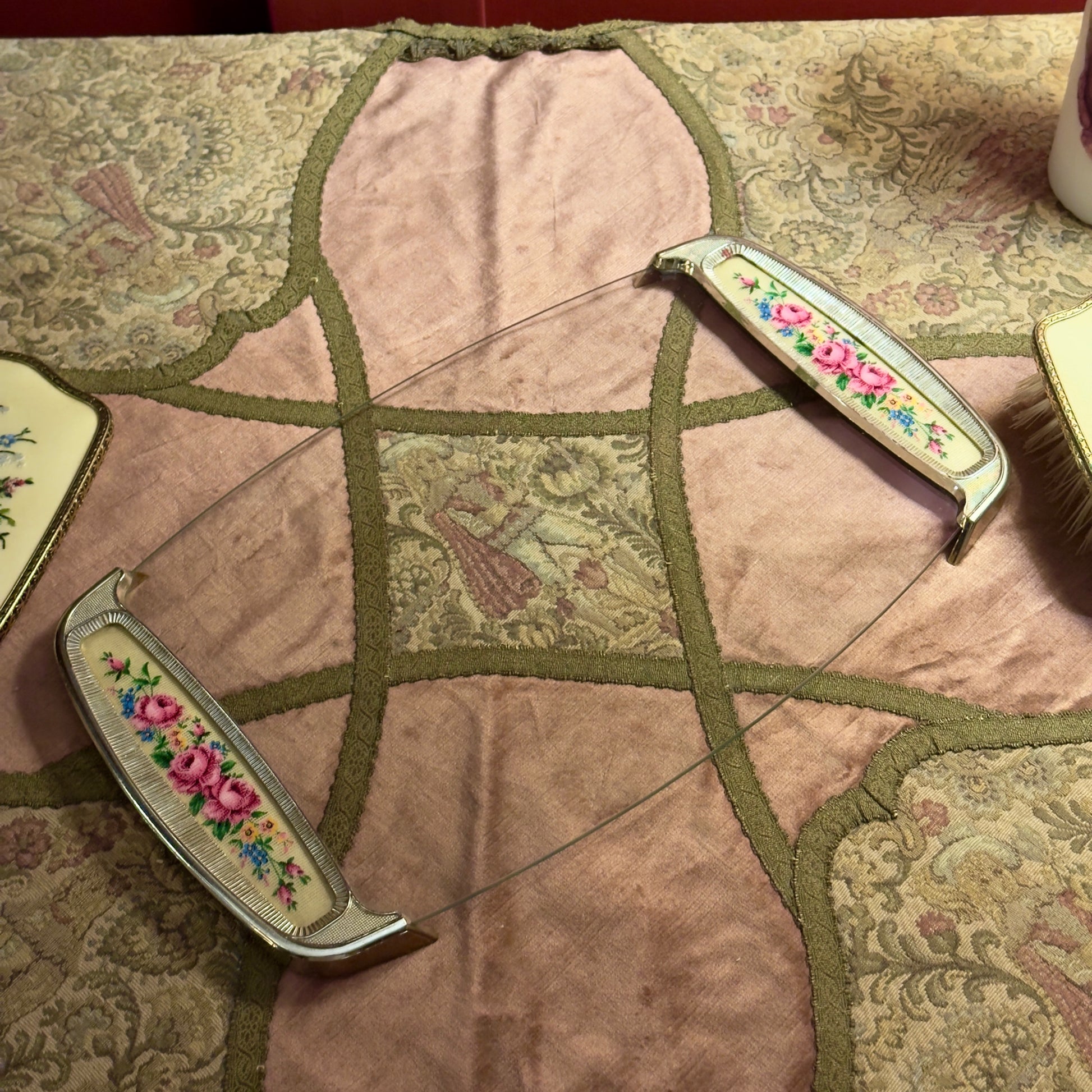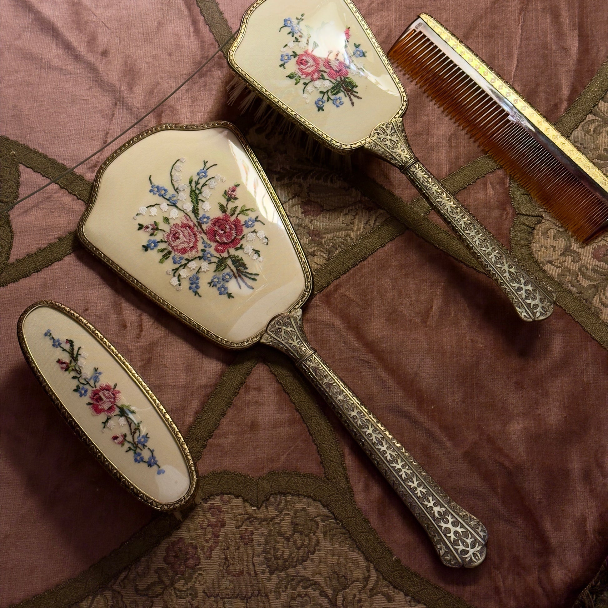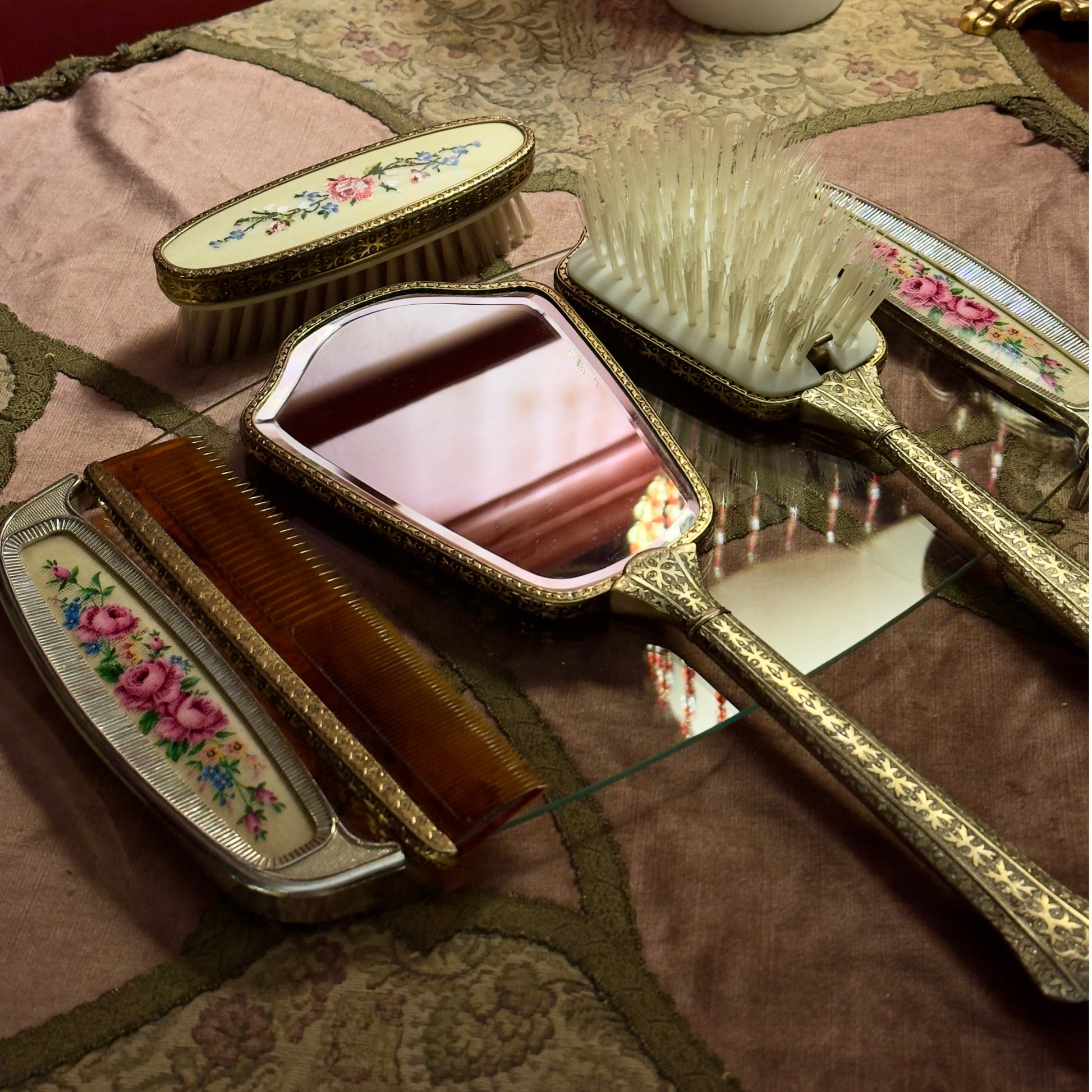 بالعلبة الاصلية مكونة من صينية زجاج ، مشط ، مشط ضعيف ، فرشاة و مرآة يدوية