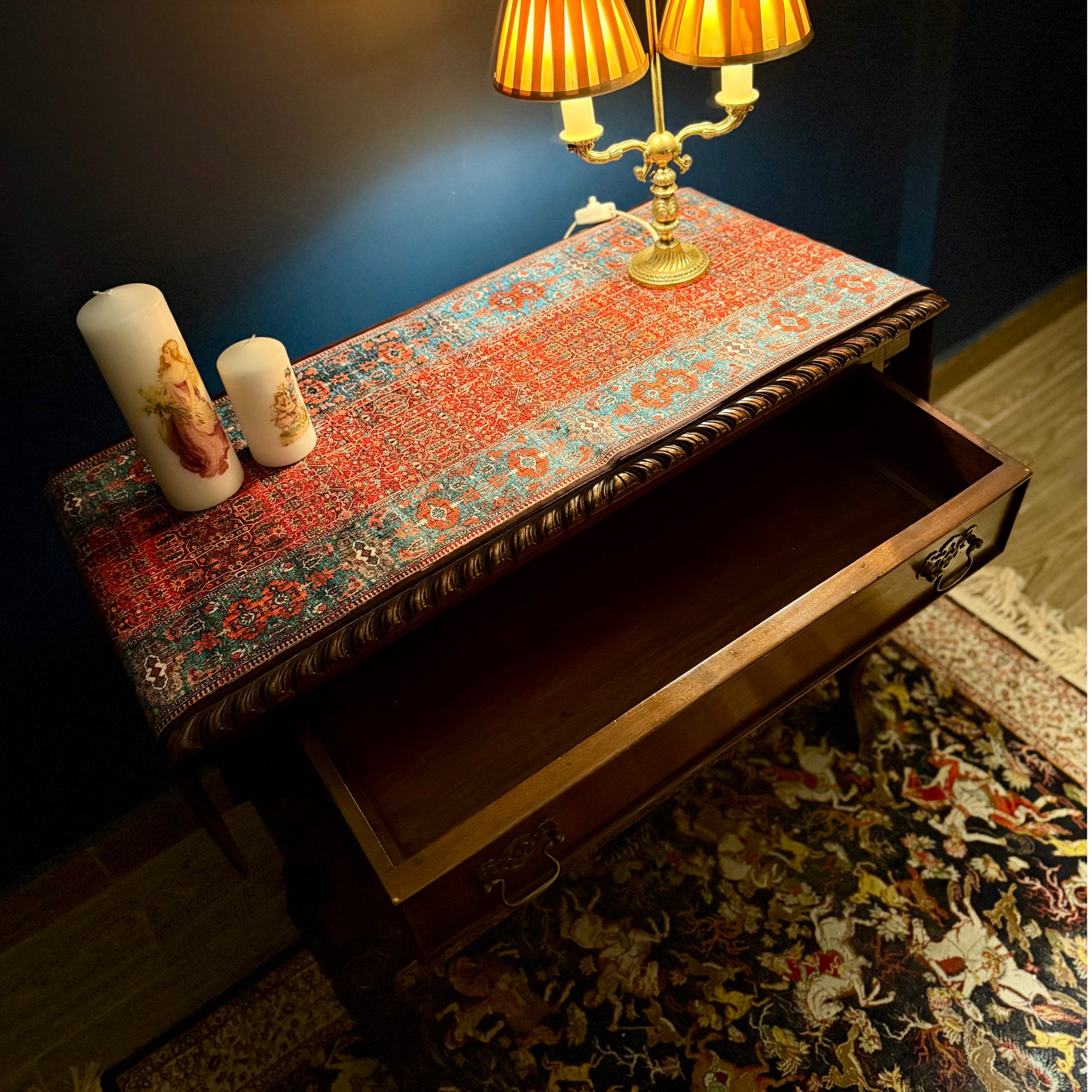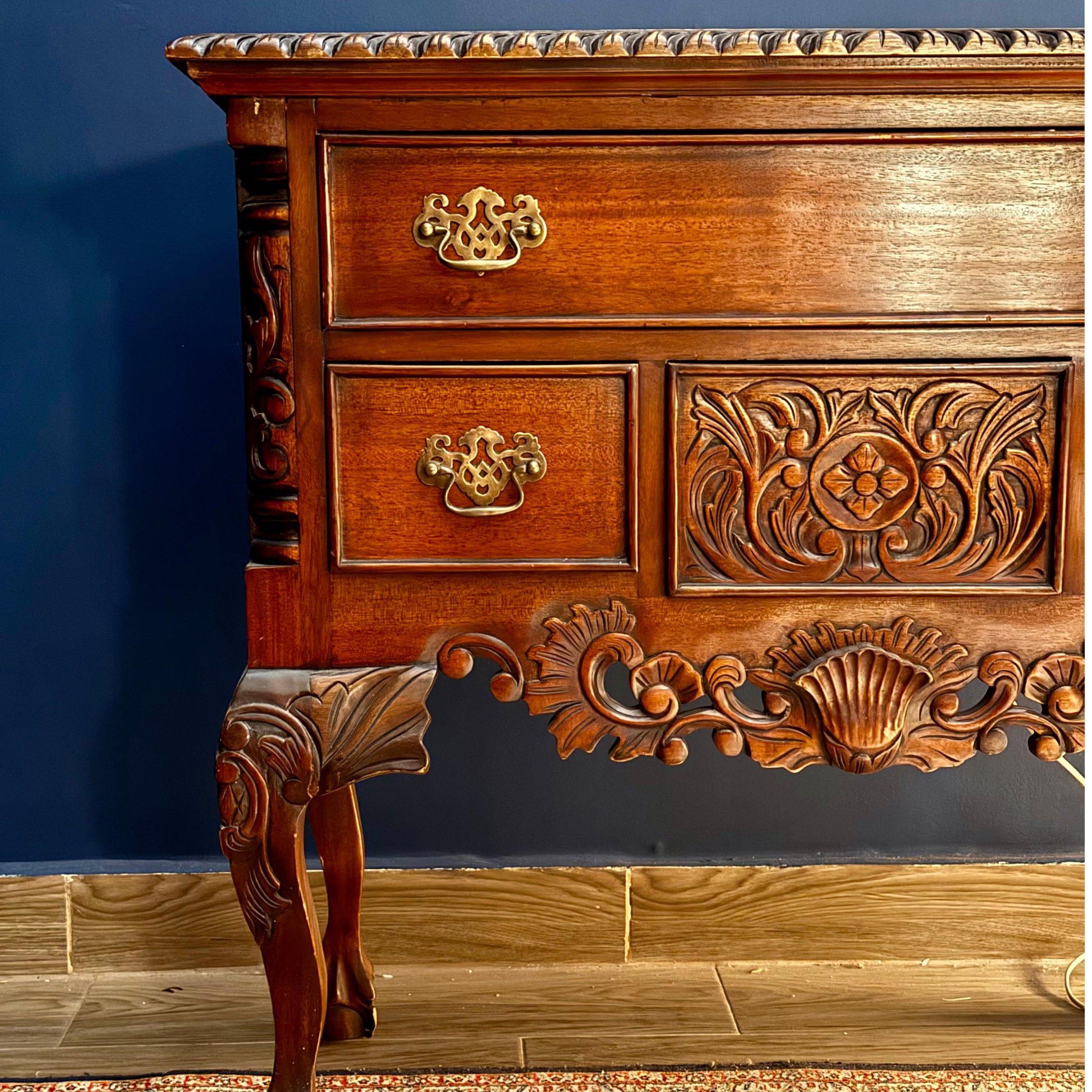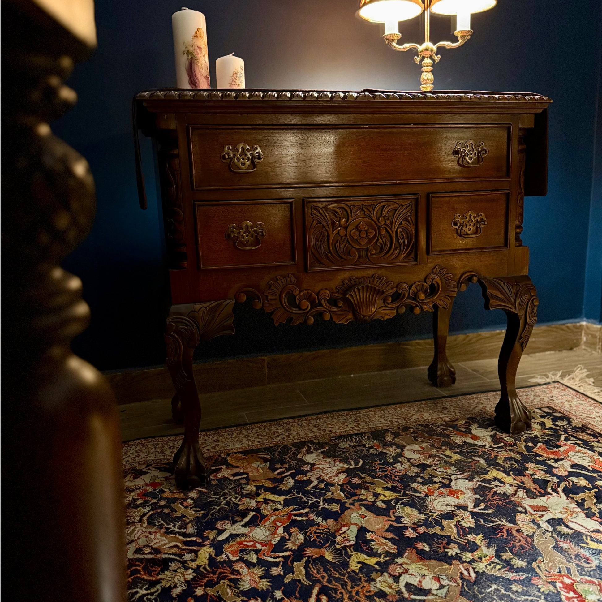 كونسول خشبي فنتج بلون بني داكن، مزخرف بنقوش بارزة ومقابض مميزة.