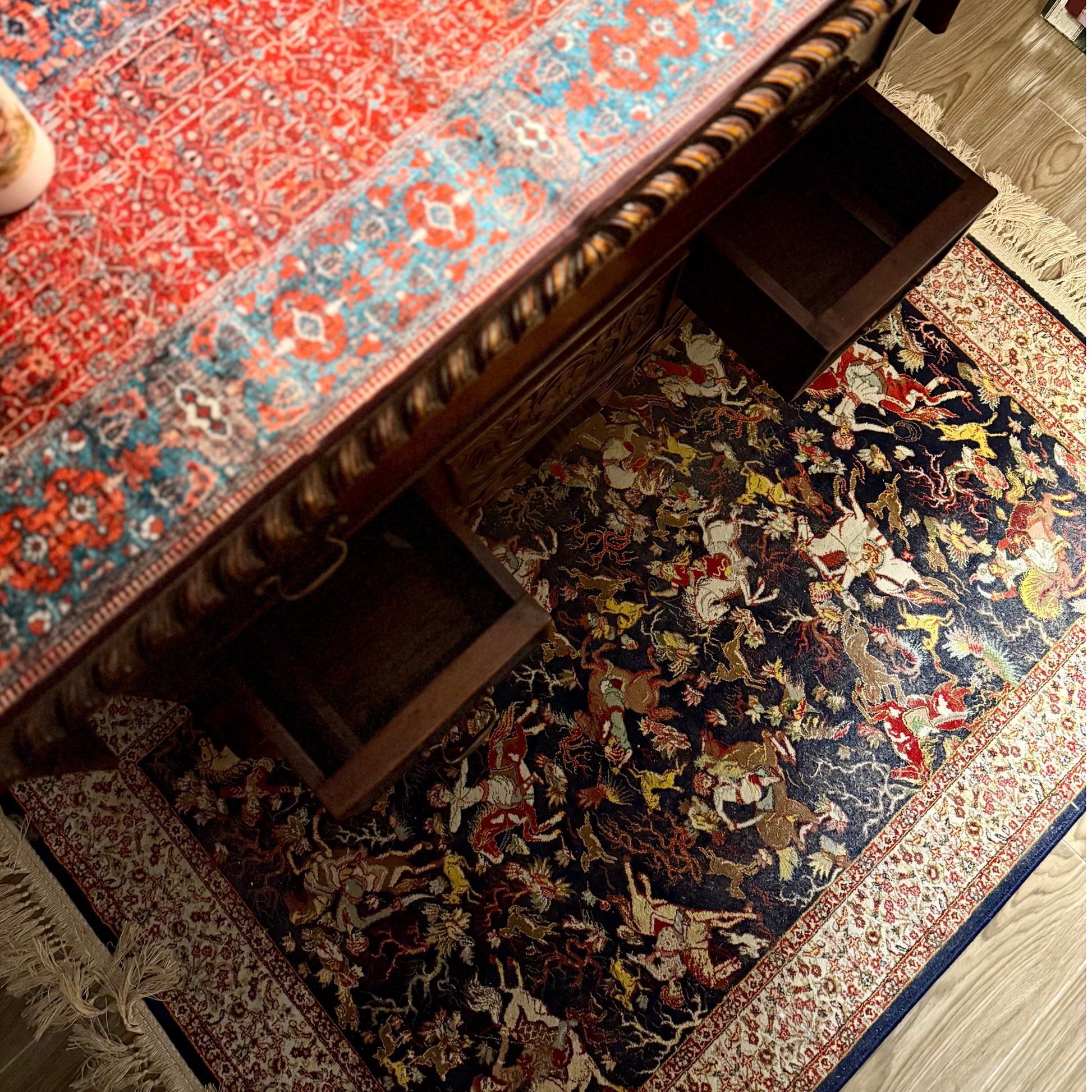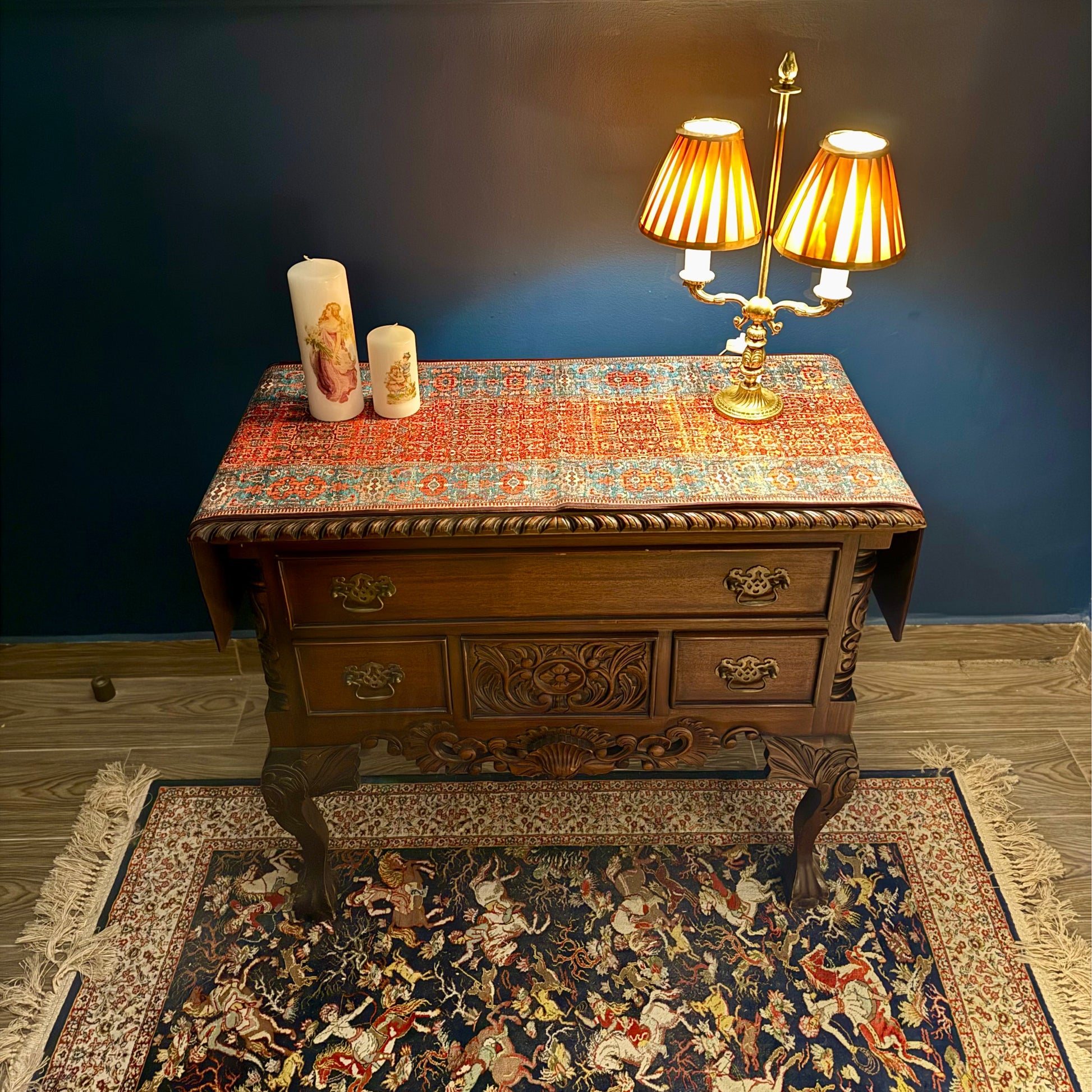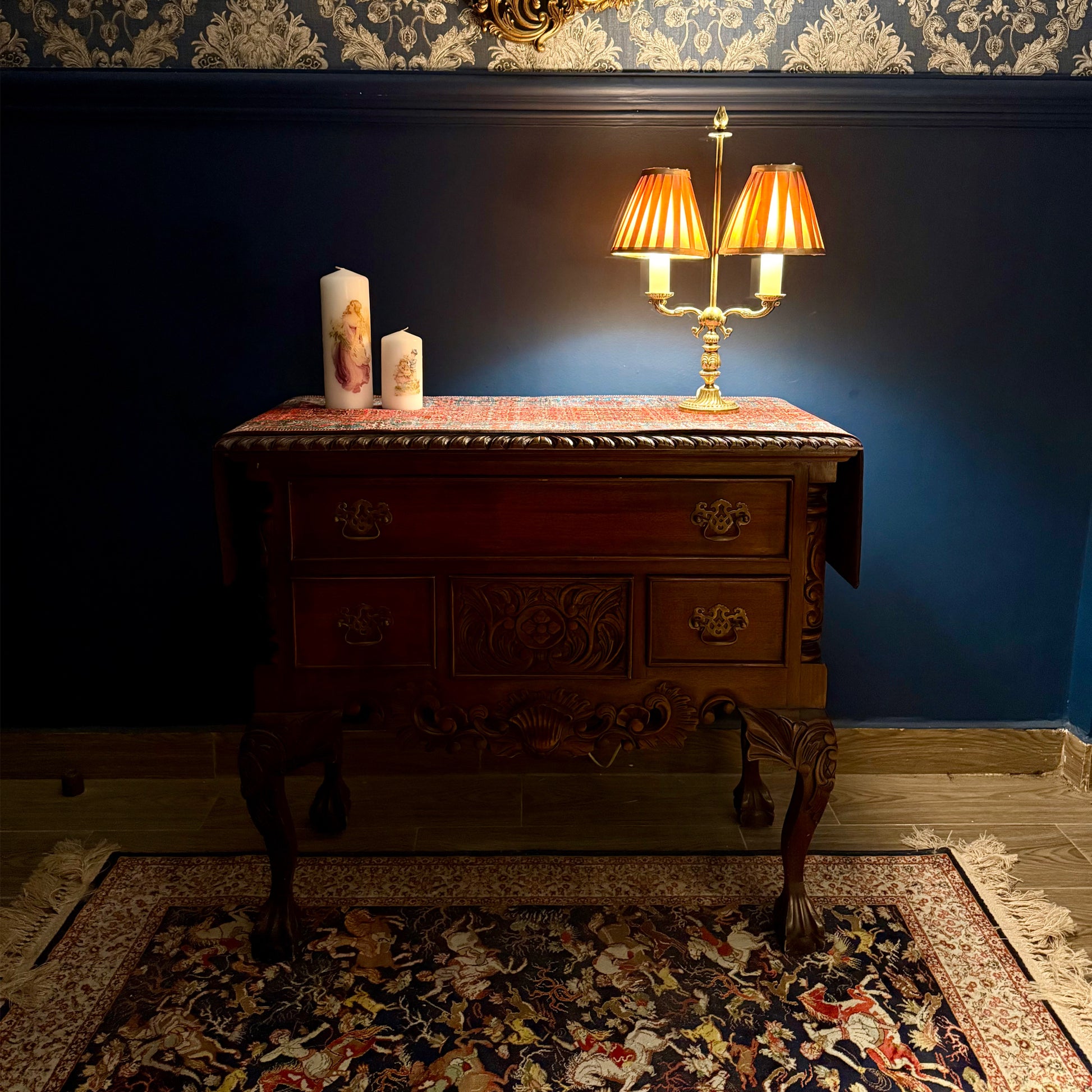 كونسول خشبي فنتج بلون بني داكن، مزخرف بنقوش بارزة ومقابض مميزة.