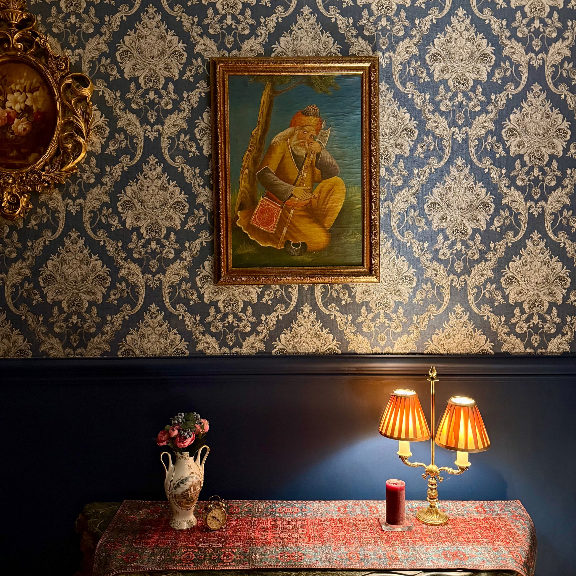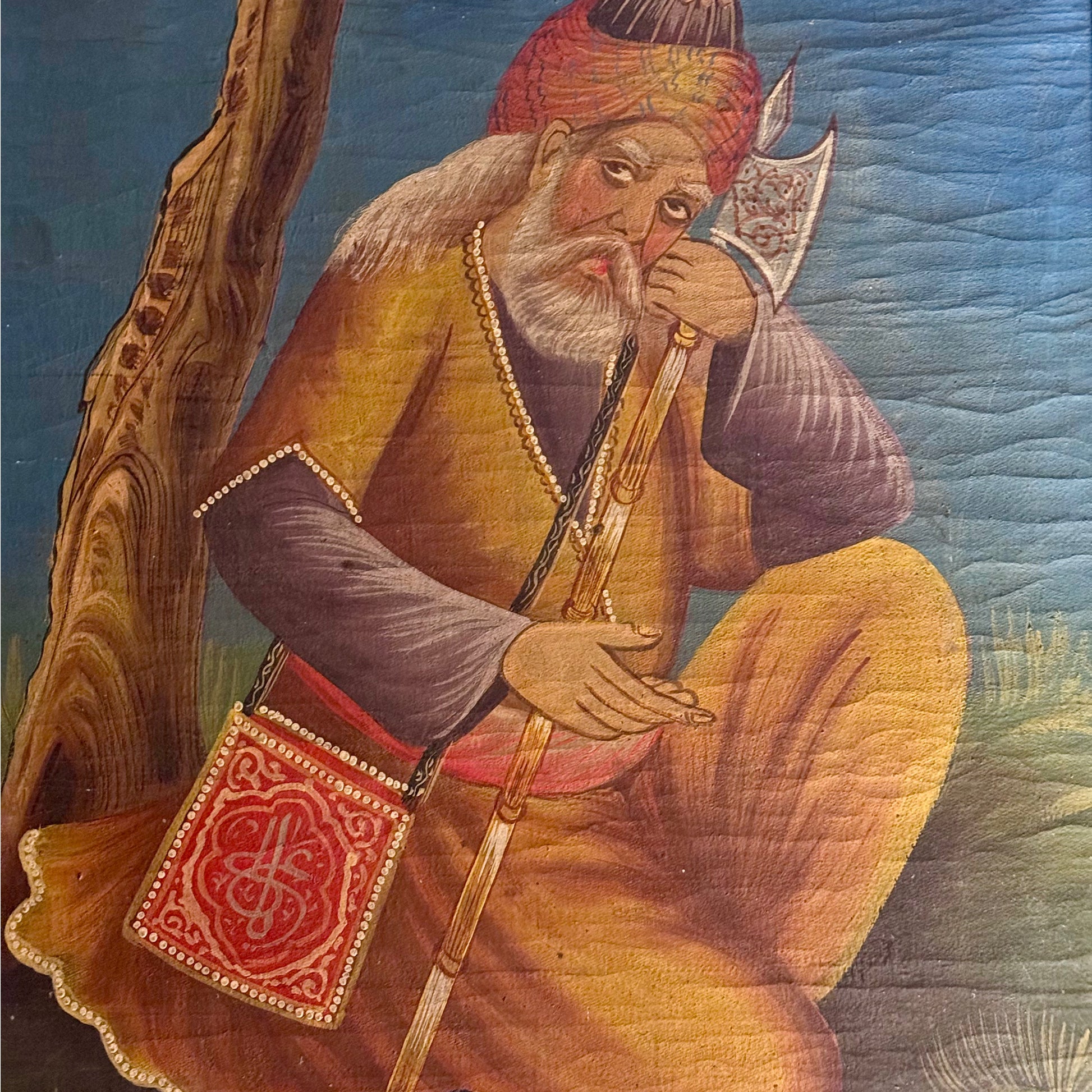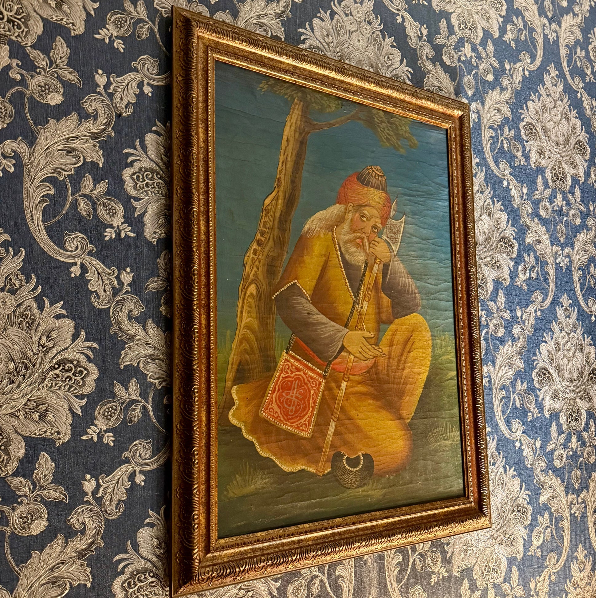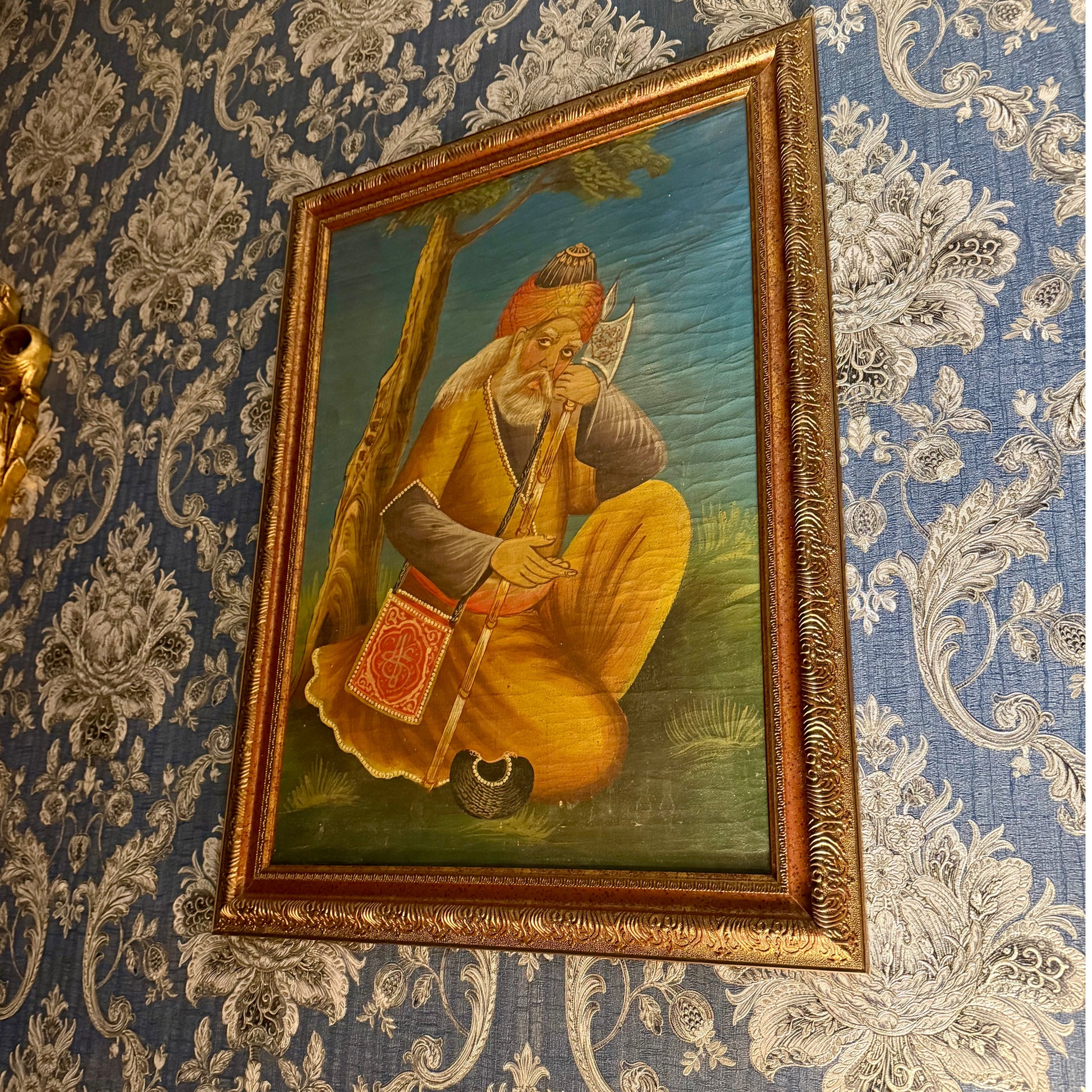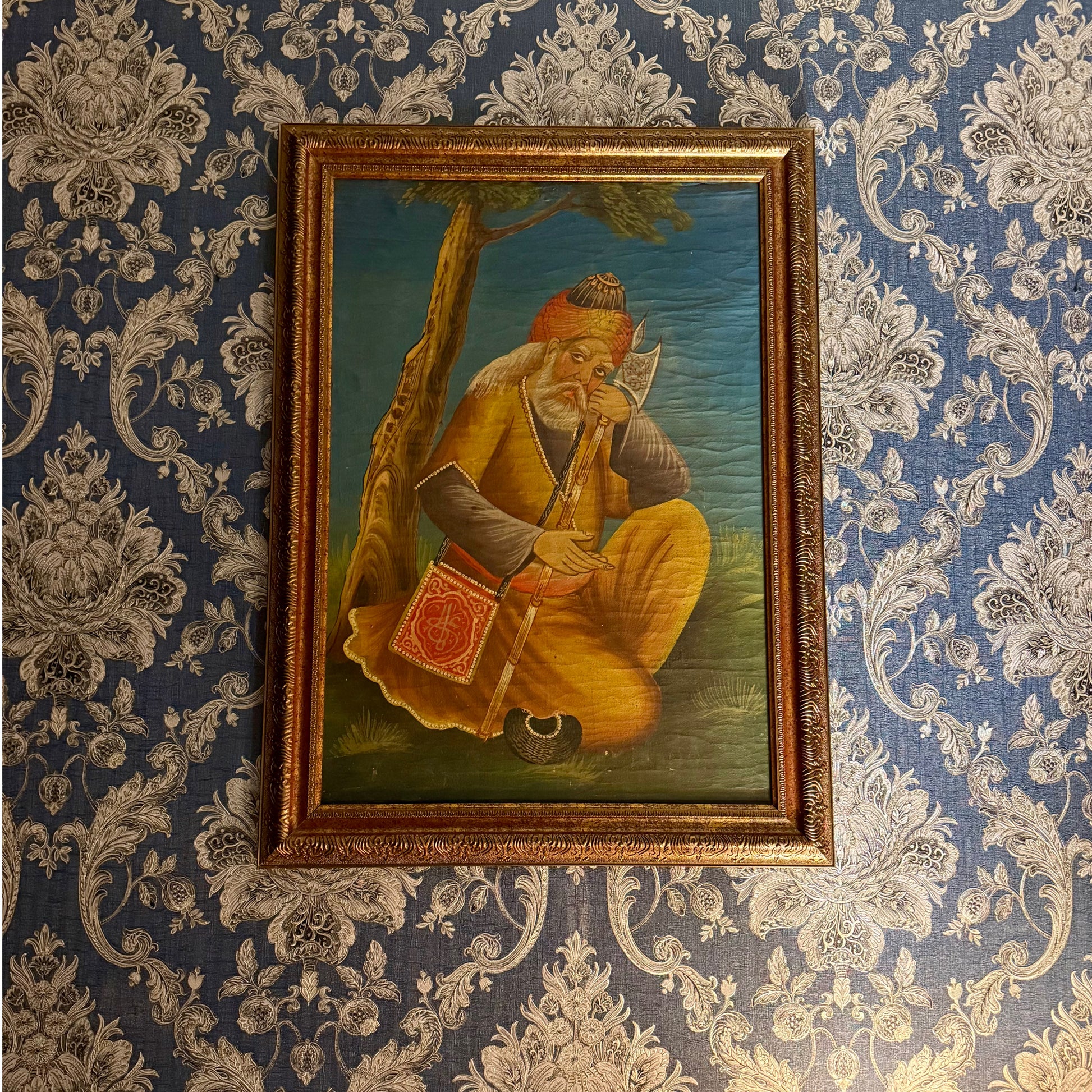 لوحة أنتيك بطابع شرقي تُجسّد شيخًا وقورًا في لحظة تأمل، بألوان دافئة هادئة وإطار مزخرف فاخر، قطعة تراثية أنيقة.